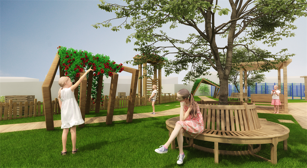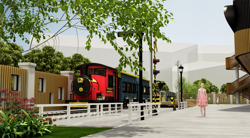 設(shè)施由連廊相連的四個樹屋陽光房,營造幼兒游戲休閑互動場景,將自然生活與游樂空間相融合。