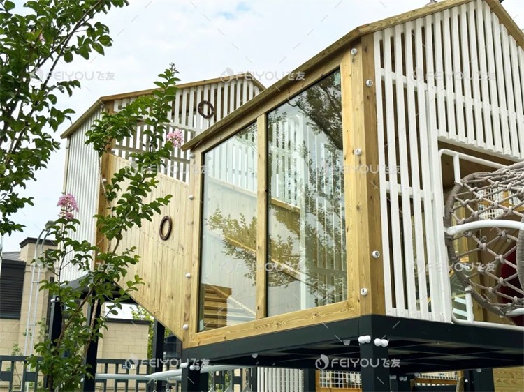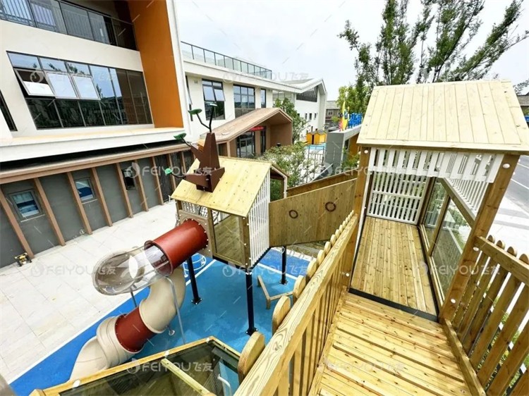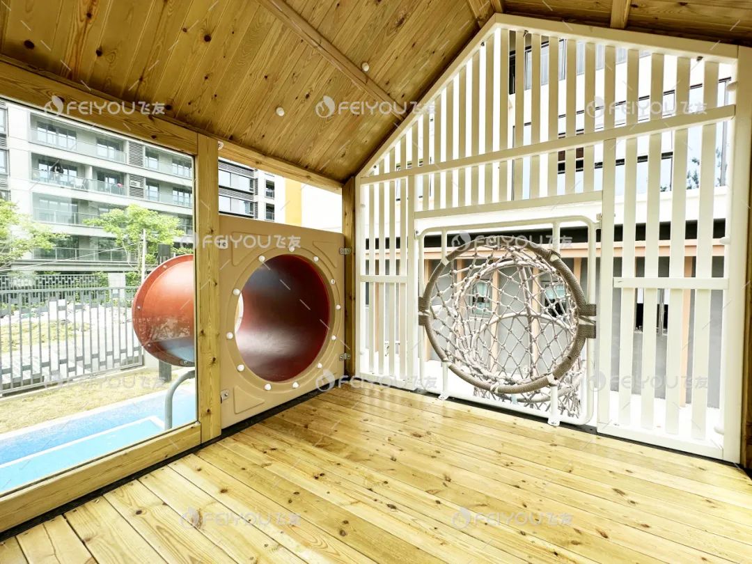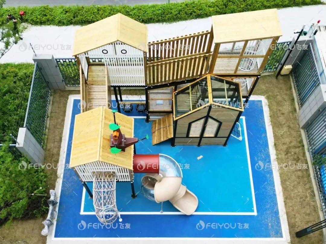 樹屋主題組合滑梯是戶外空間其中的一大亮點(diǎn)。設(shè)計(jì)師通過不同高度和結(jié)構(gòu)的樹屋設(shè)計(jì),幫助孩子們鍛煉空間感知和身體協(xié)調(diào)性。