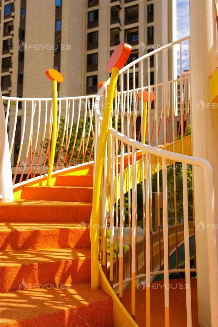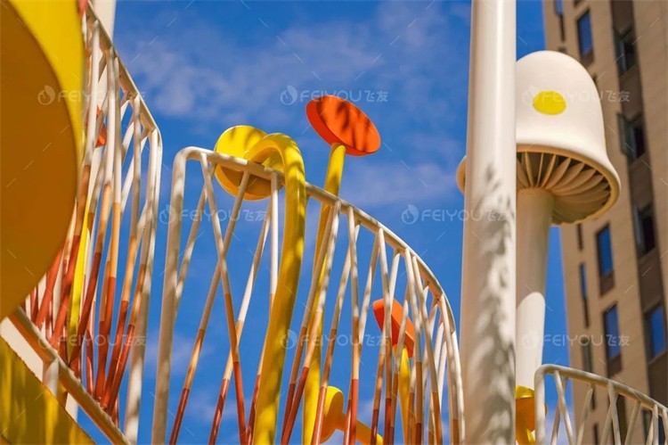 一根根大小不一的蘑菇高高聳立,讓人感覺自己像是童話世界里的小人。雙層的不規(guī)則平臺,交叉穿梭忽上忽下,仿佛讓人置身于叢林之中。凌亂的彩虹欄桿讓人眼花繚亂,頗有魔幻吸引之感。在這里,我們是故事的主角,一起領(lǐng)略蘑菇園里的美麗風(fēng)景。