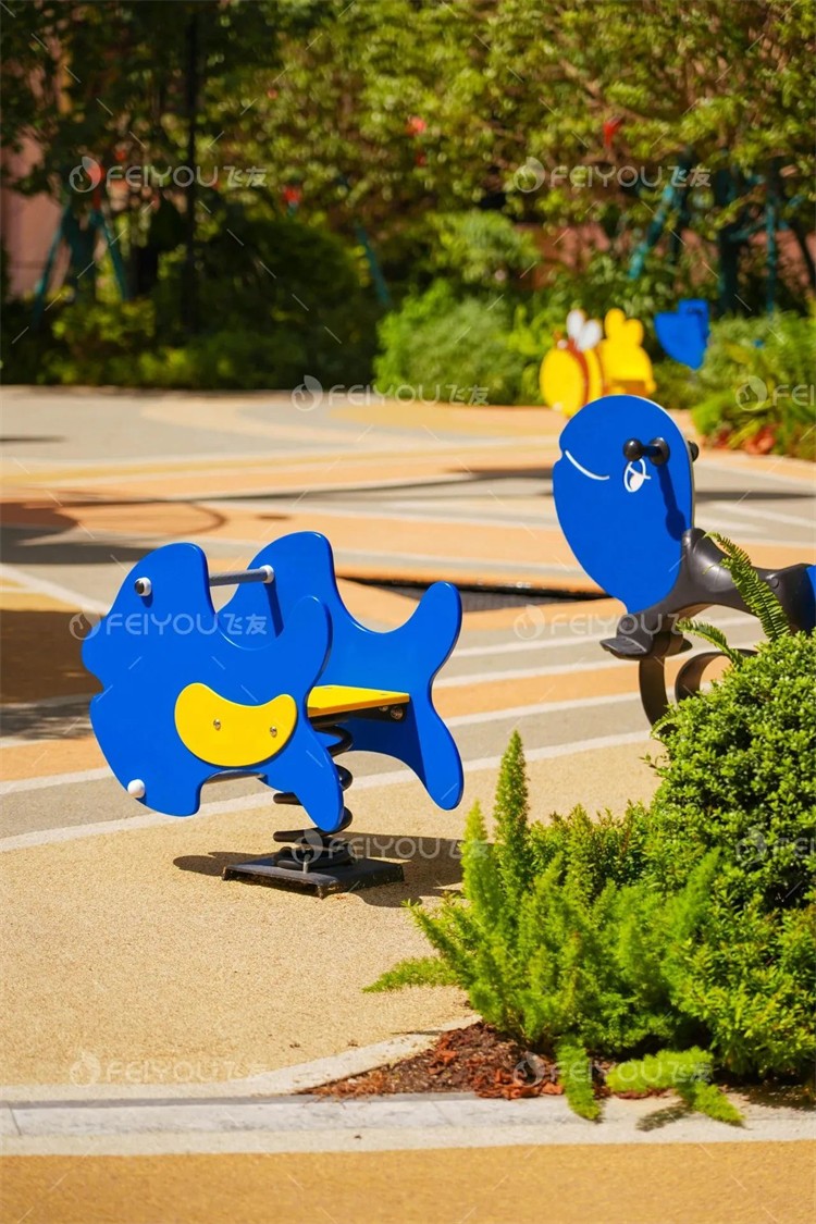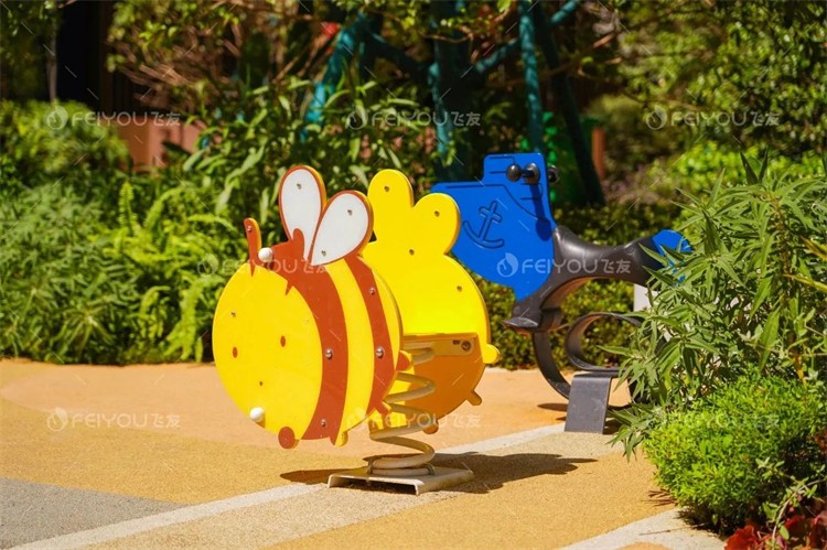 場地后方設(shè)置了幾個可愛搖搖樂,偏向低齡孩子的坐騎。就像是森林里的小精靈,帶給孩子們無限歡樂的同時,可以增強(qiáng)孩子的視覺空間。樹蔭一側(cè)設(shè)置休息區(qū),方便大孩子們照看撒歡的“冒險家”。